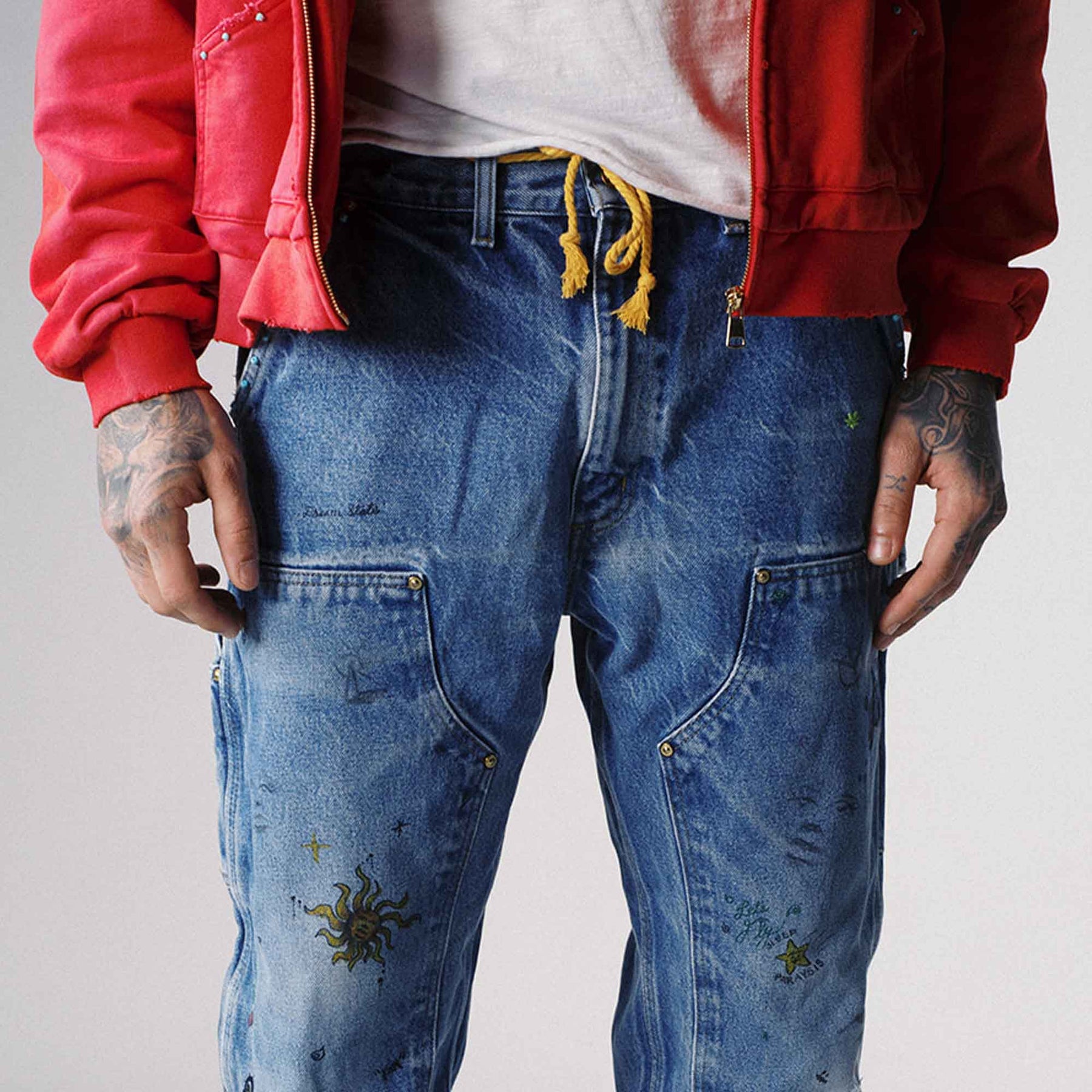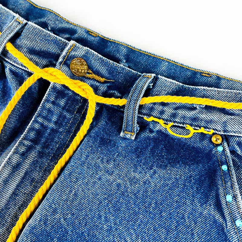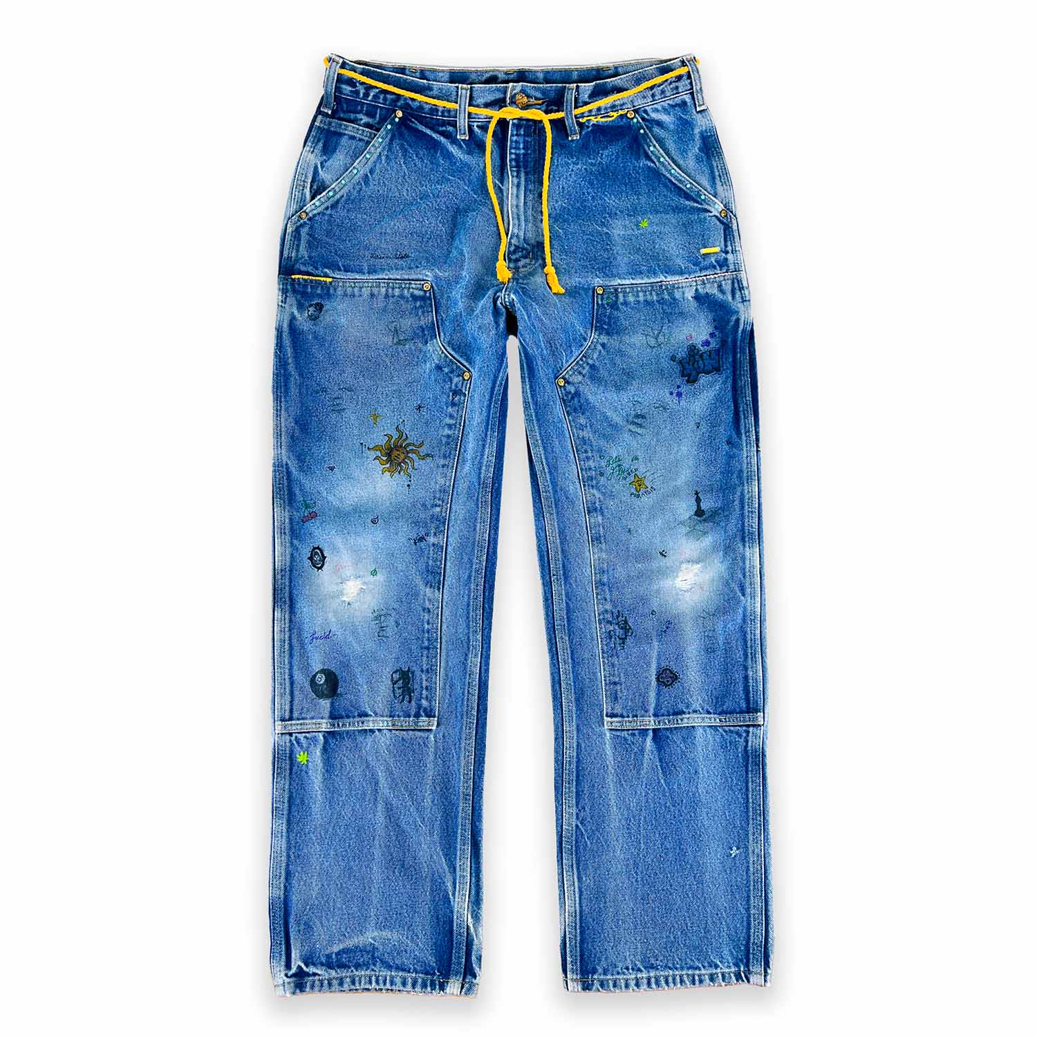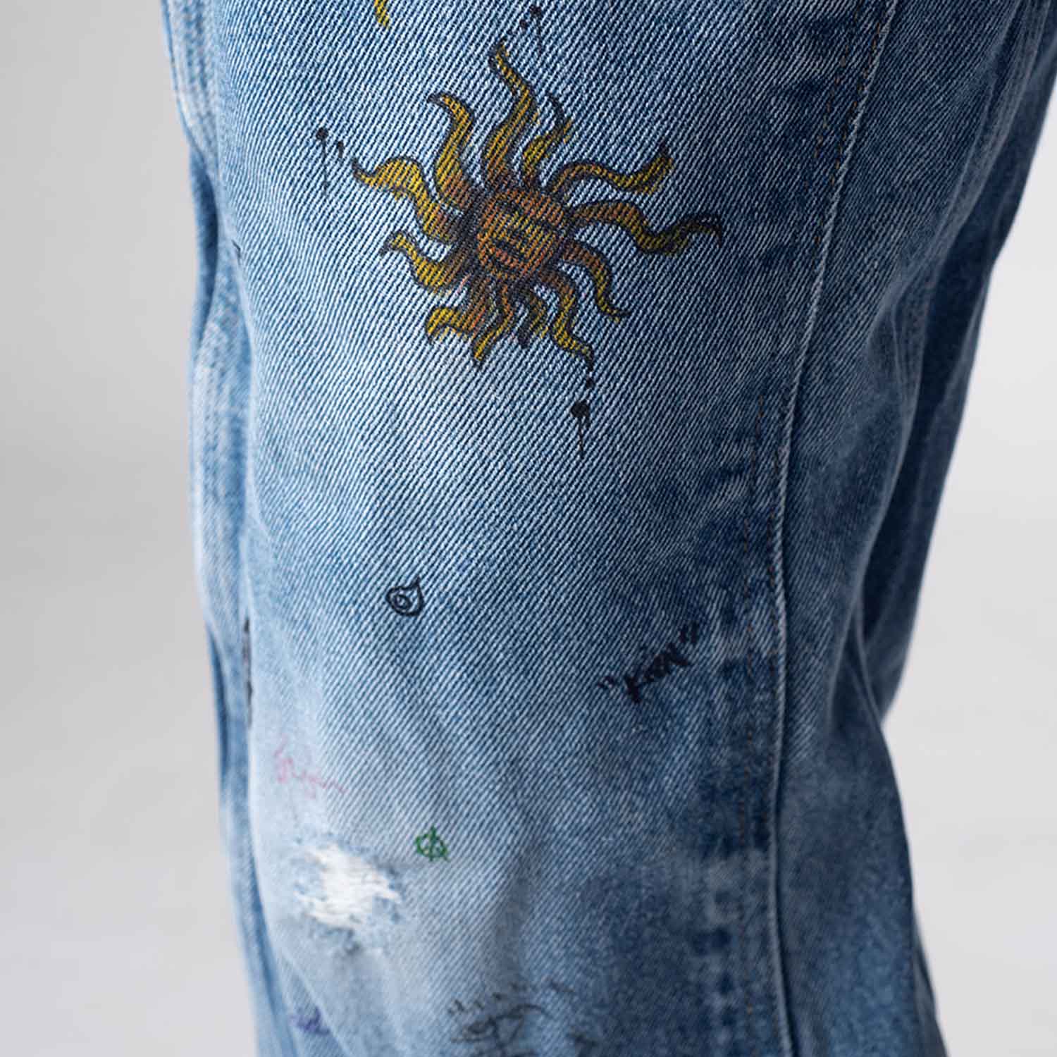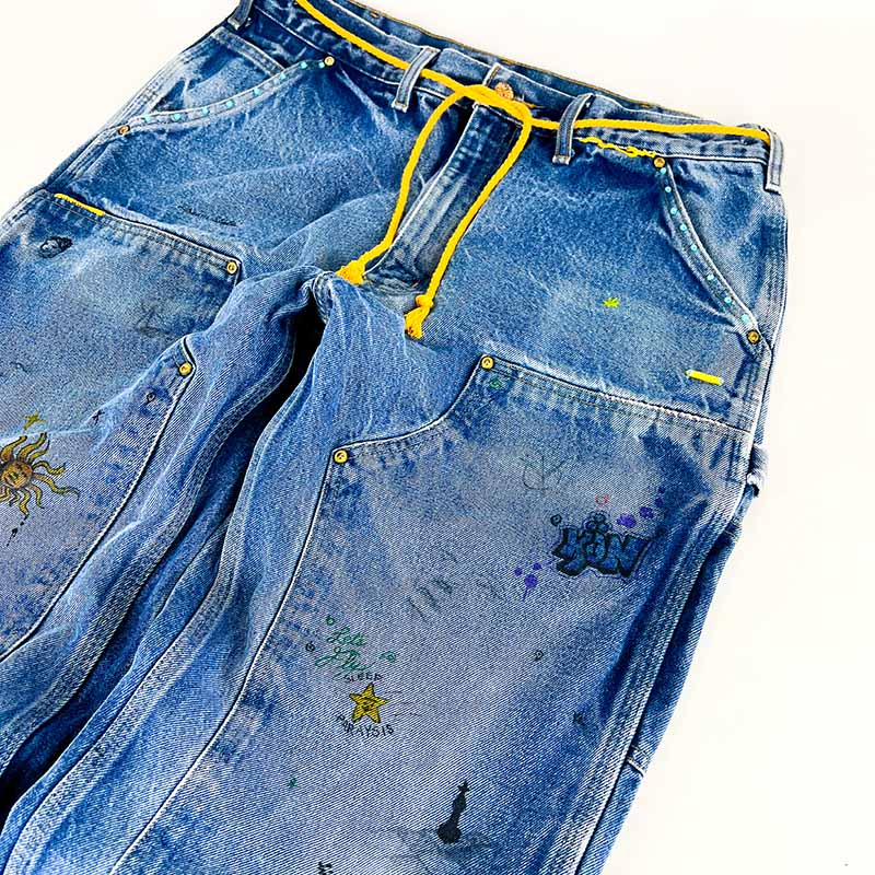 A one of one creation, featuring hand drawn artworks that visit the realm of the latest collection: Dream State. Vintage Persian fabrics from 1980's are used as a patch, along with custom gold hardware and rope drawstring for an effortless aesthetic.