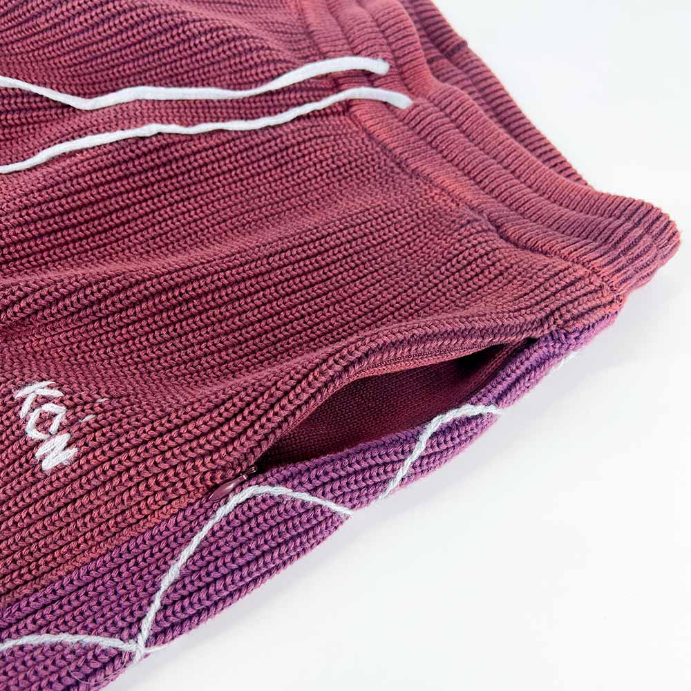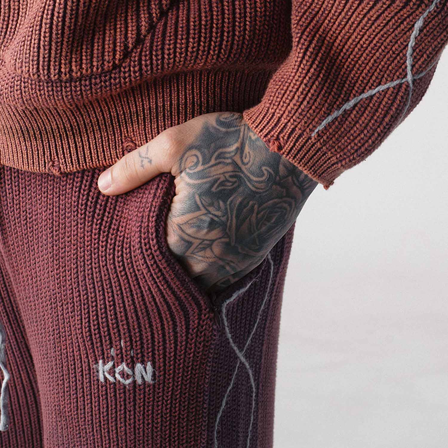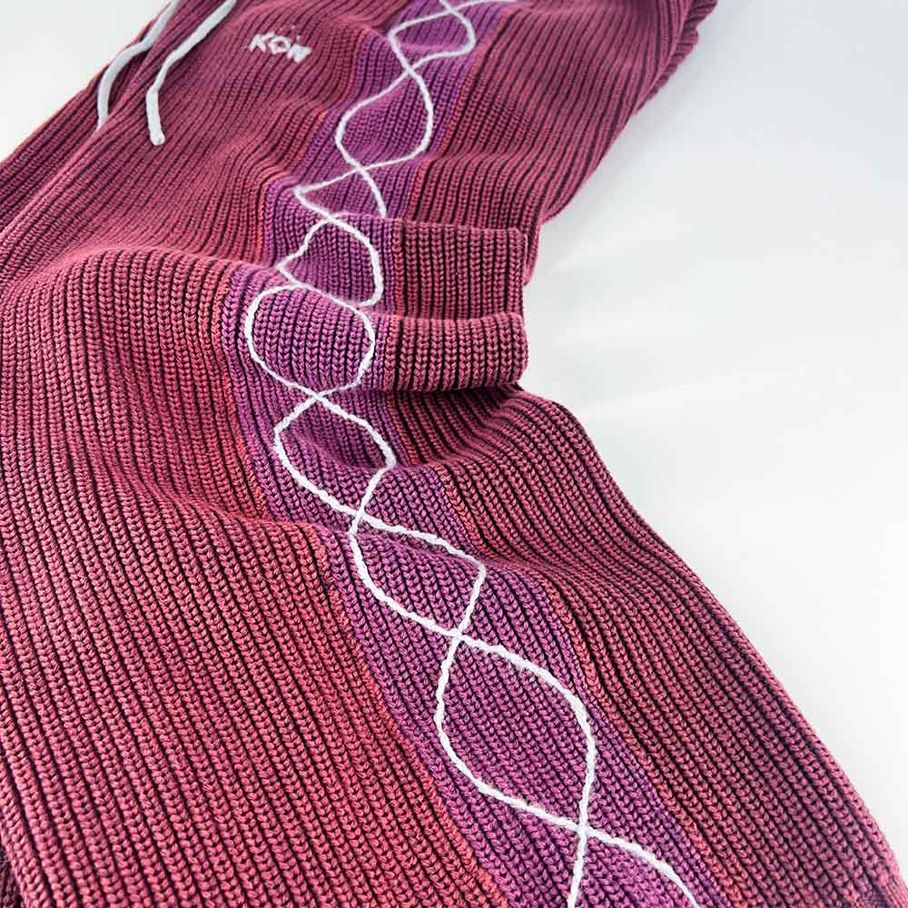 A baggy fit crafted from acid washed cable knit cotton. DNA style hand sewn details trail down each leg. Signature KON logo stitch accents the leg details, with 2 zip pockets and one back welt pocket.