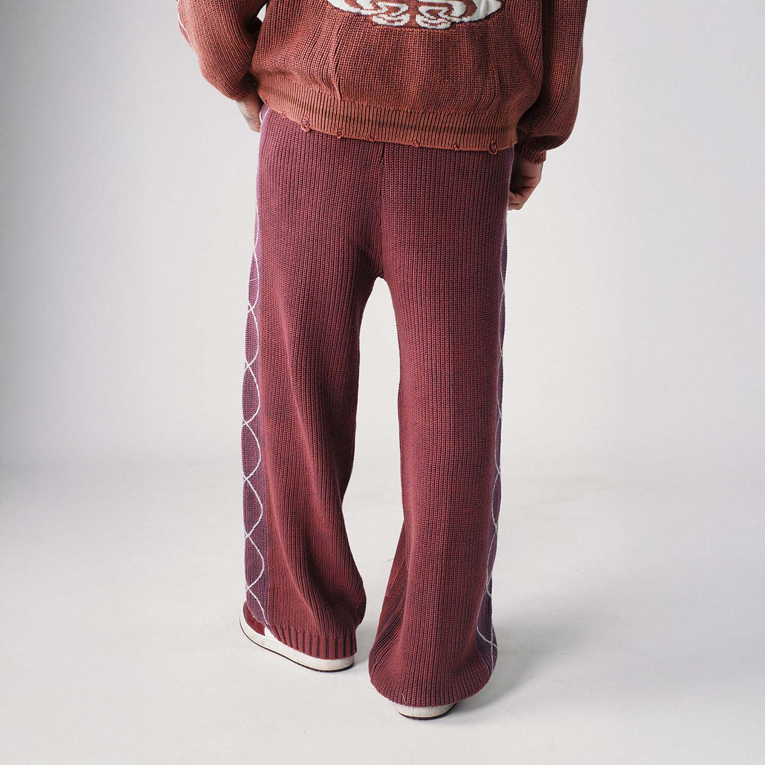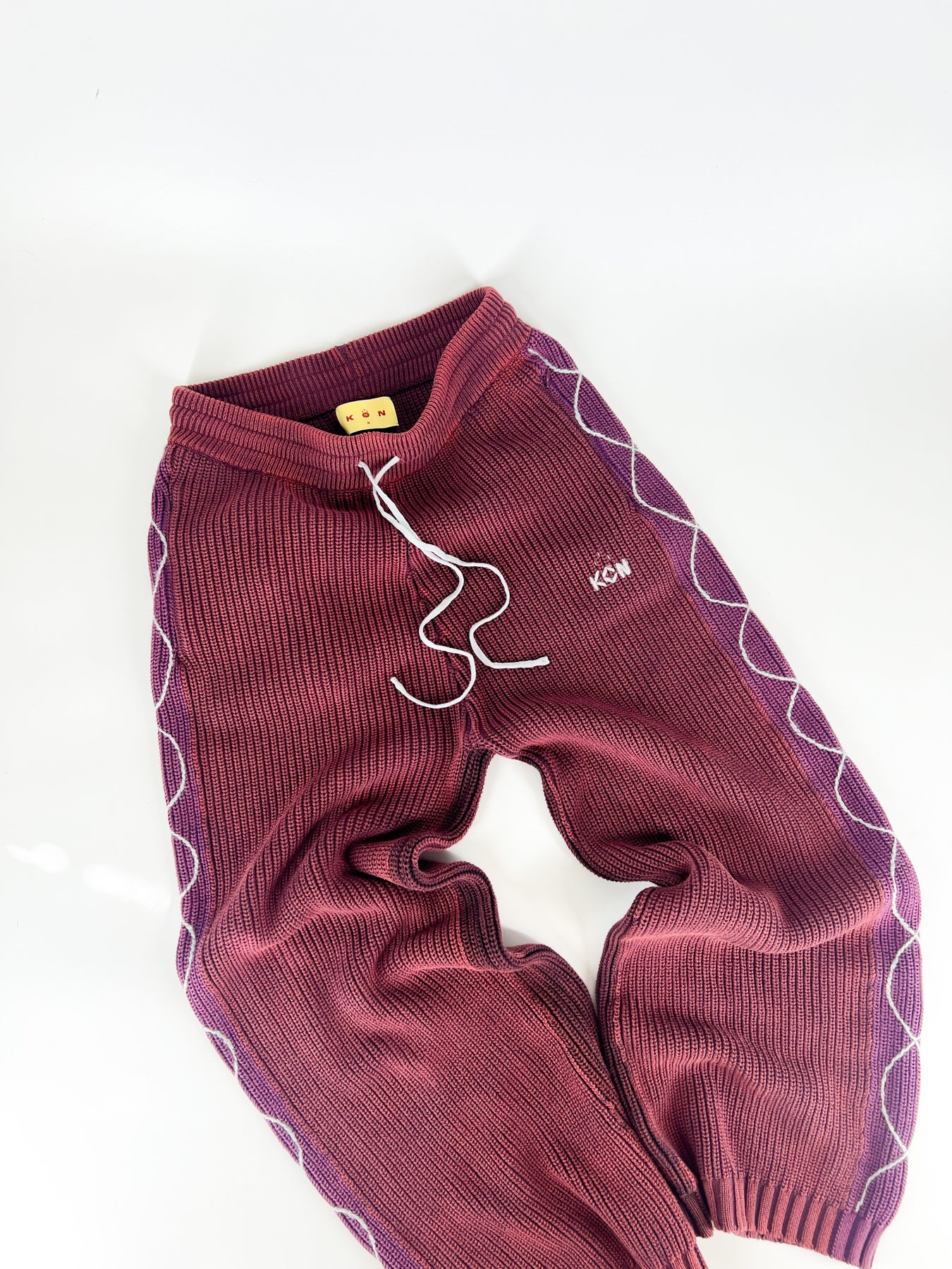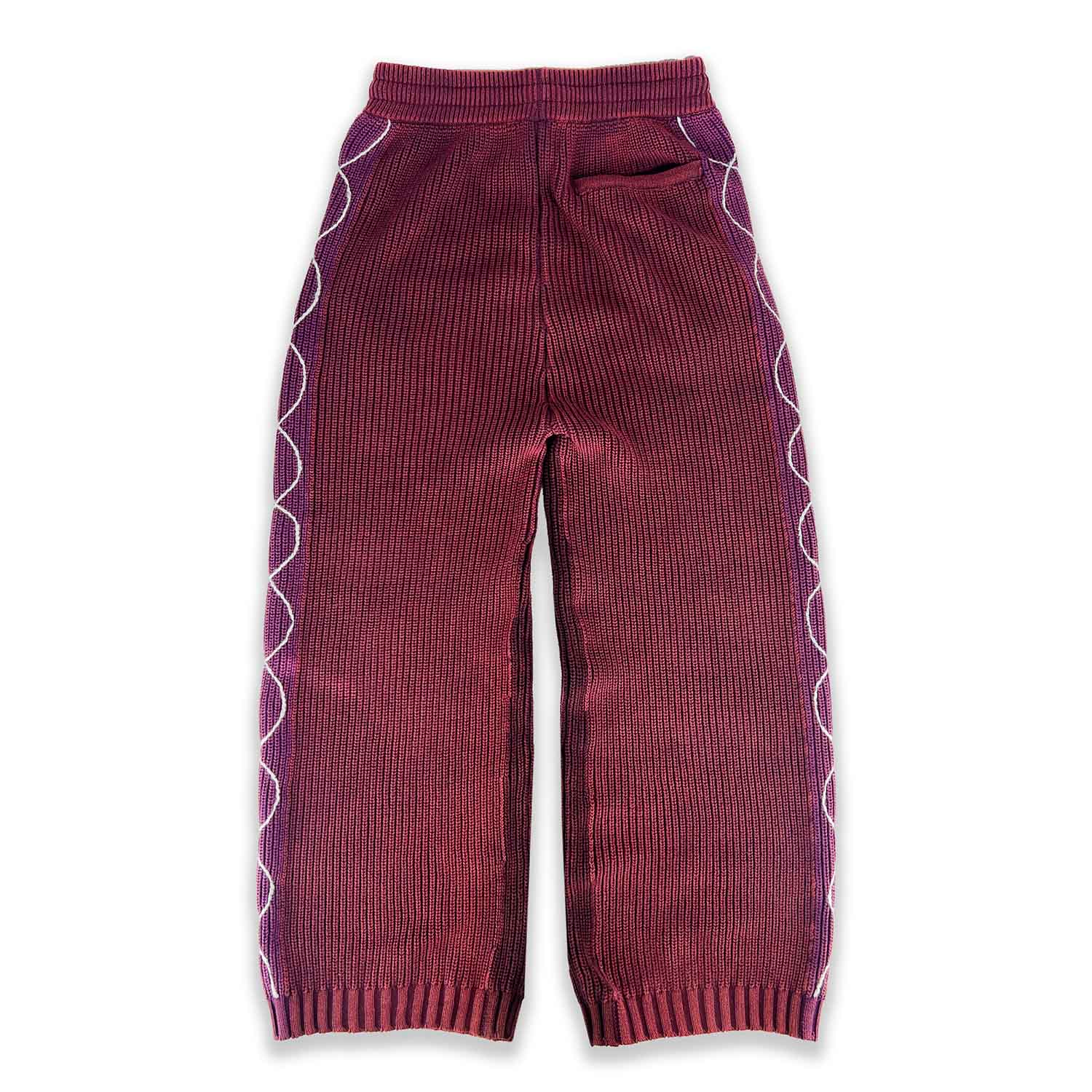 A baggy fit crafted from acid washed cable knit cotton. DNA style hand sewn details trail down each leg. Signature KON logo stitch accents the leg details, with 2 zip pockets and one back welt pocket.