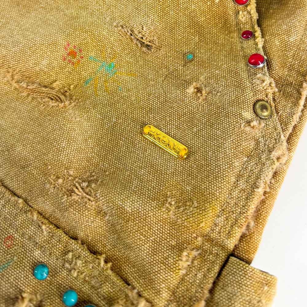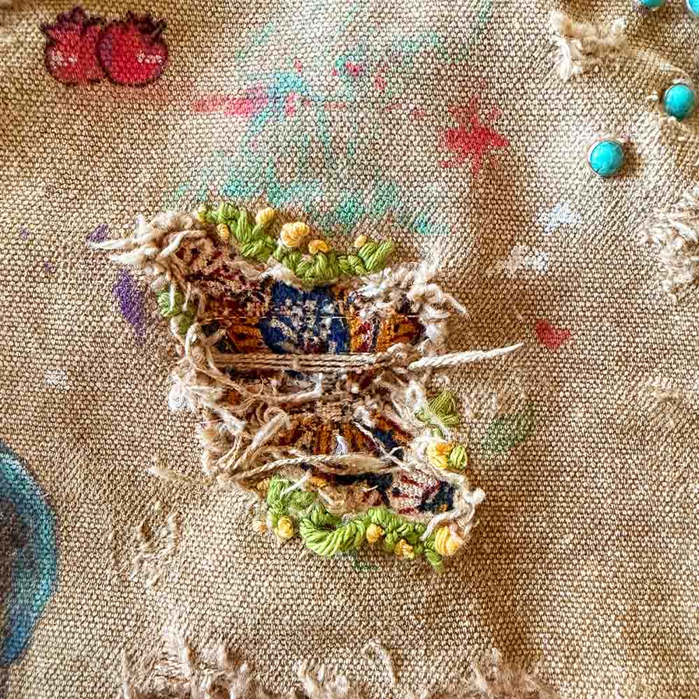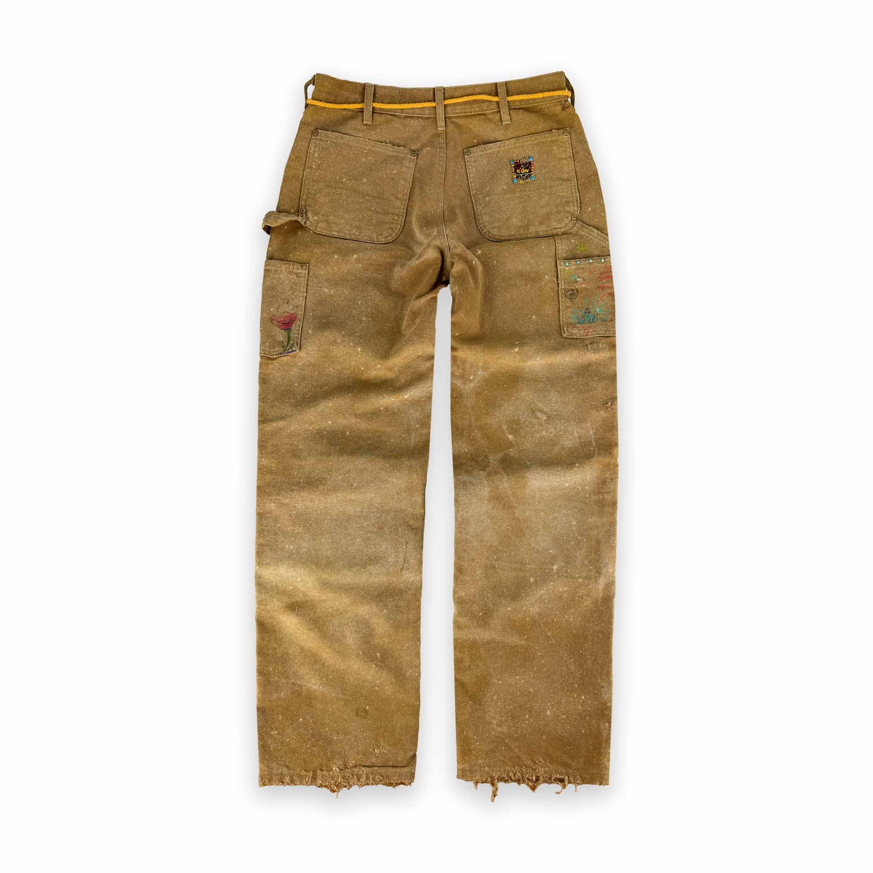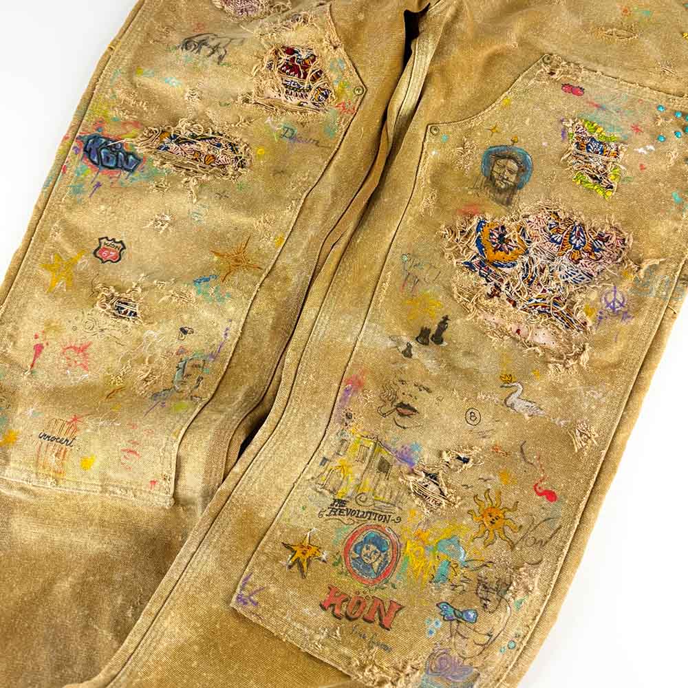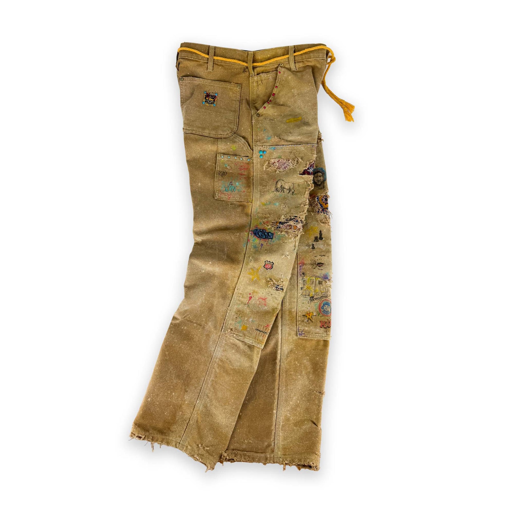 A one of one creation, featuring days of hand crafted labor and natural aging effects. Vintage Persian fabrics from 1970's are used as a repair patches, along with custom gold hardware and rope drawstring for an effortless belt aesthetic. You will notice new details every time you wear them, as hidden faces and faded artworks are scattered so deeply within the pants, that photos can not do it justice.