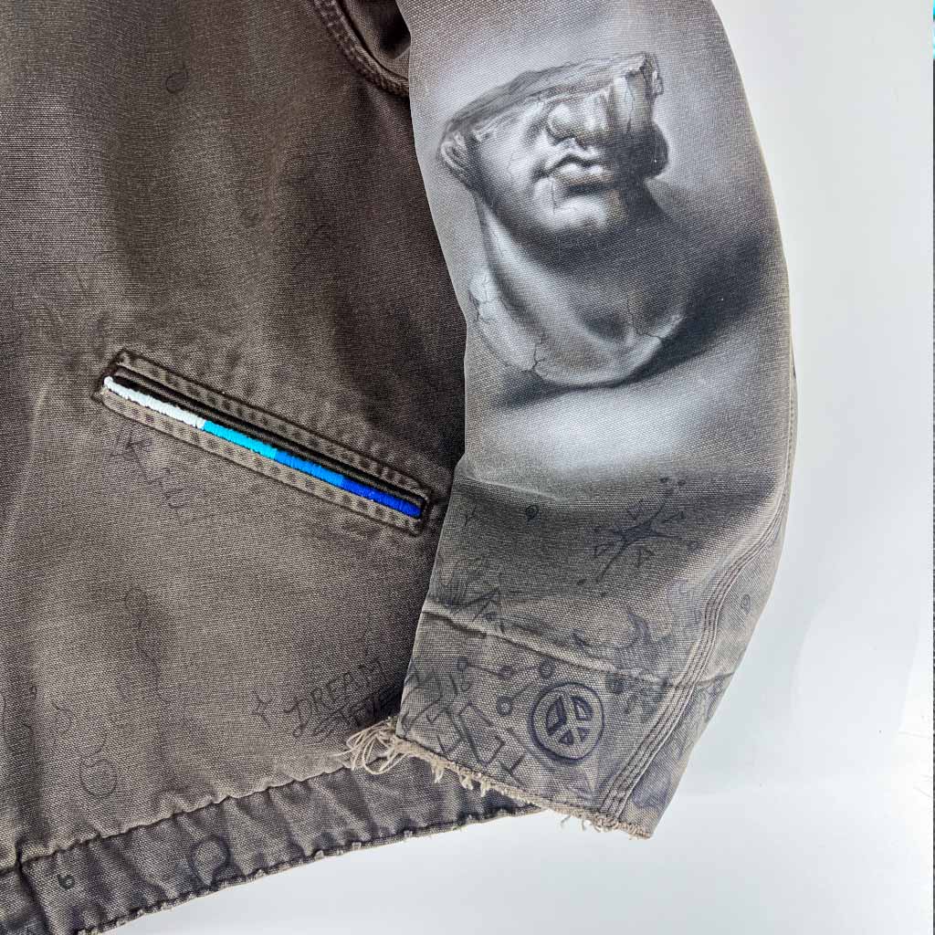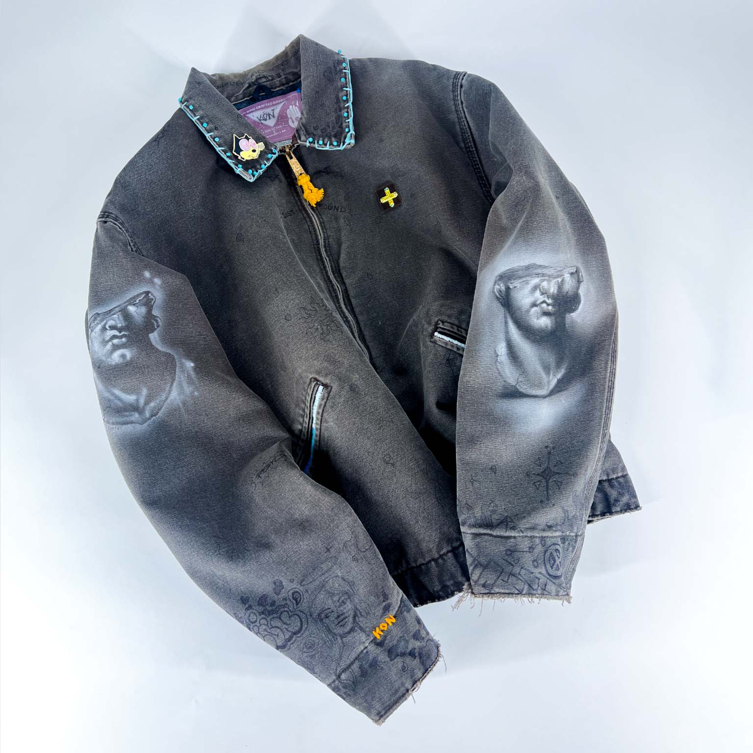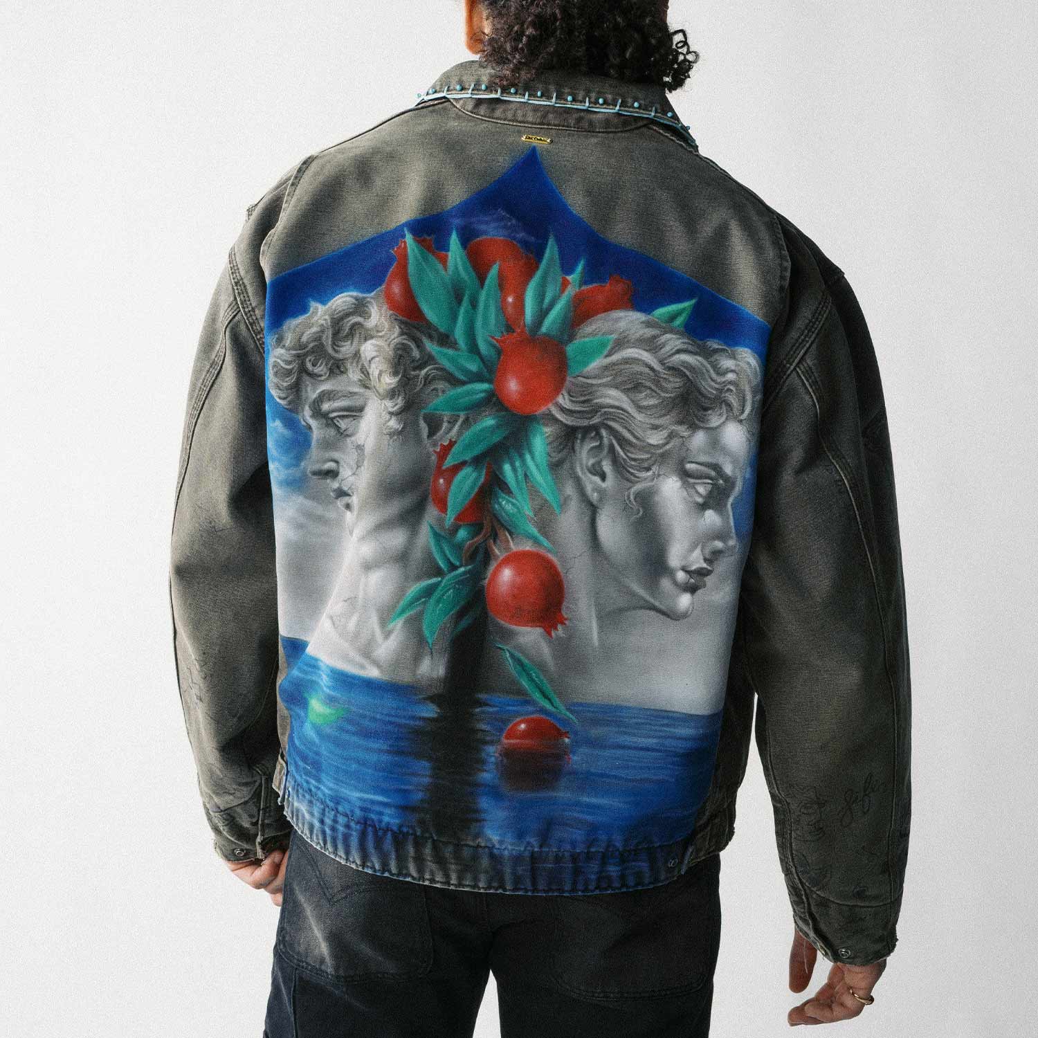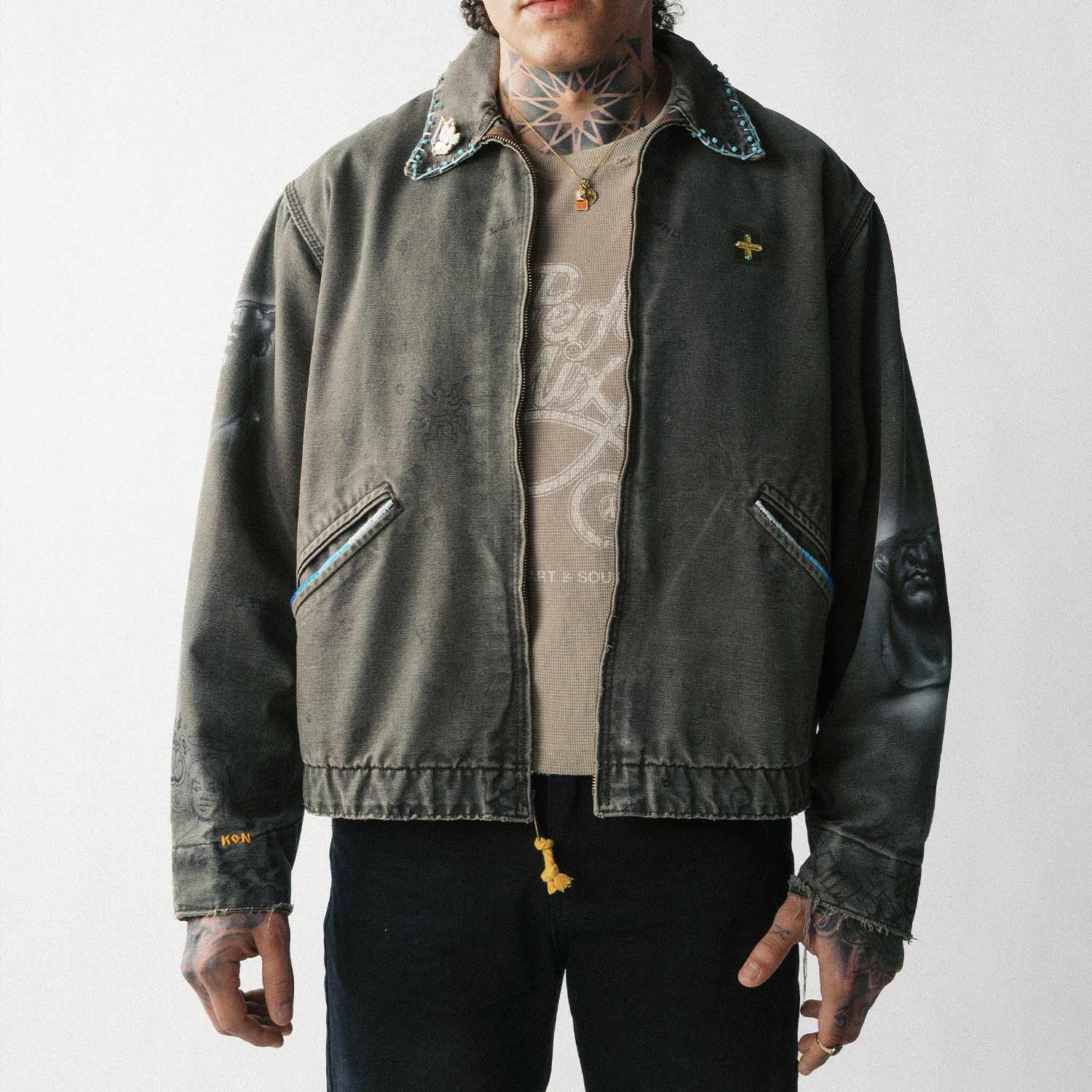 A surreal vision captured through a window on the back of this jacket. Paired with hidden hand drawn details and sewn accents, a true masterpiece of collaborative efforts between KON and airbrush artist Jeff Coffey.
