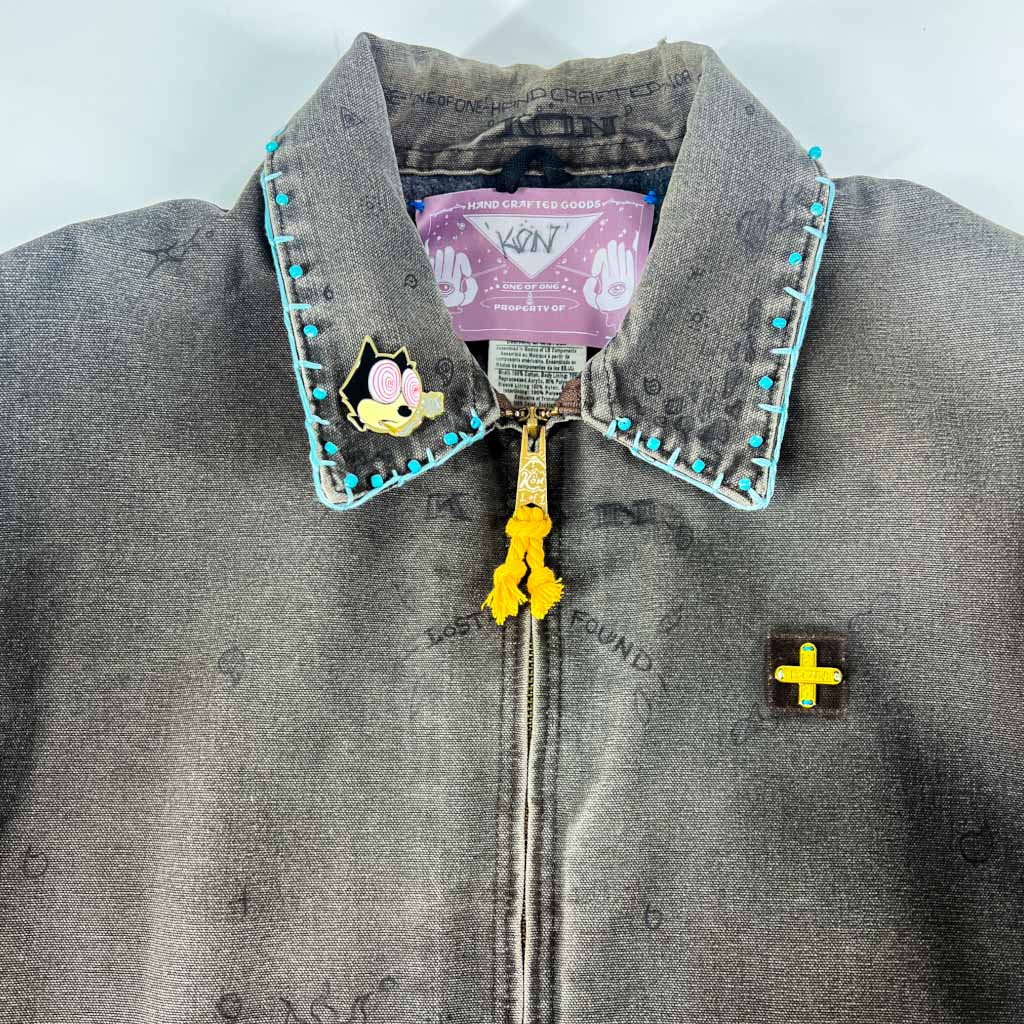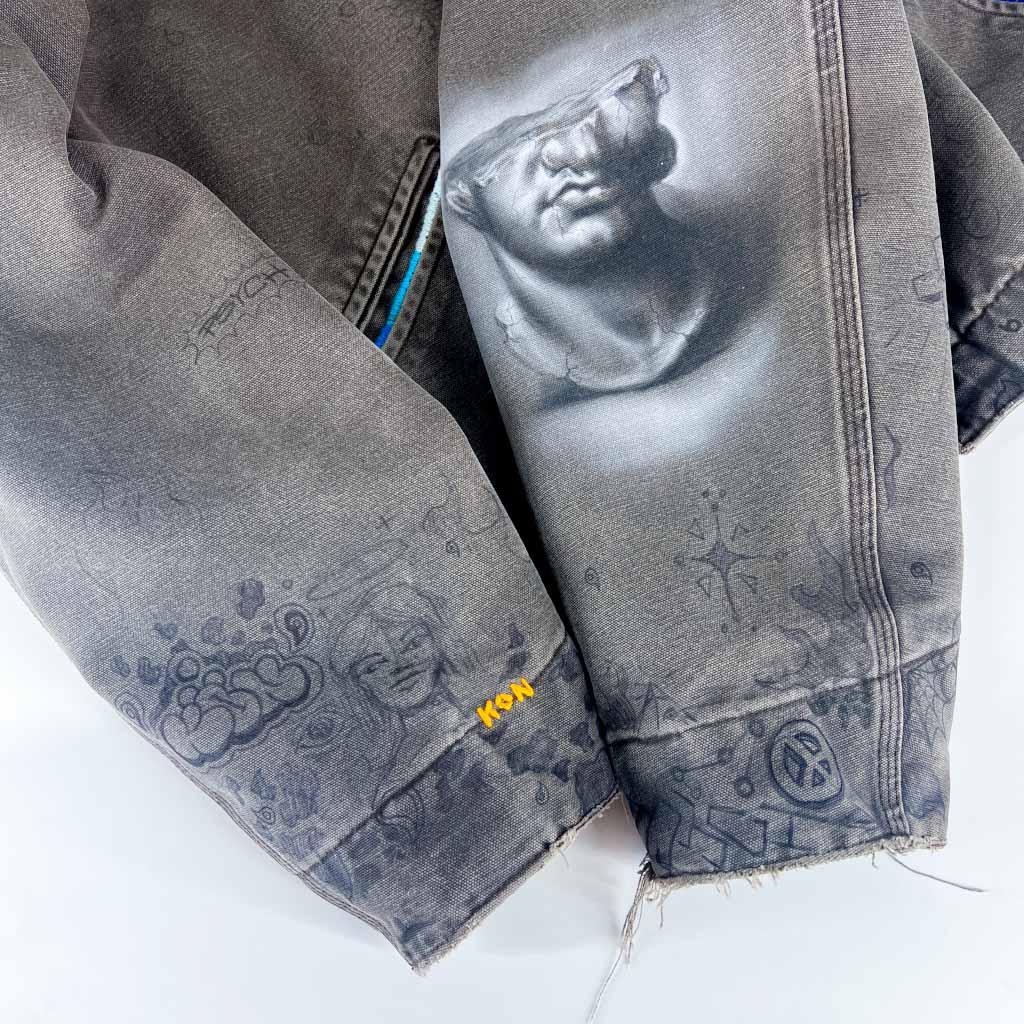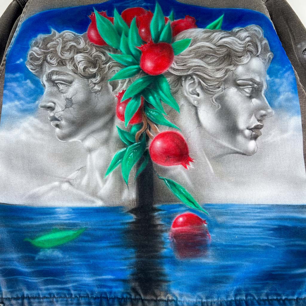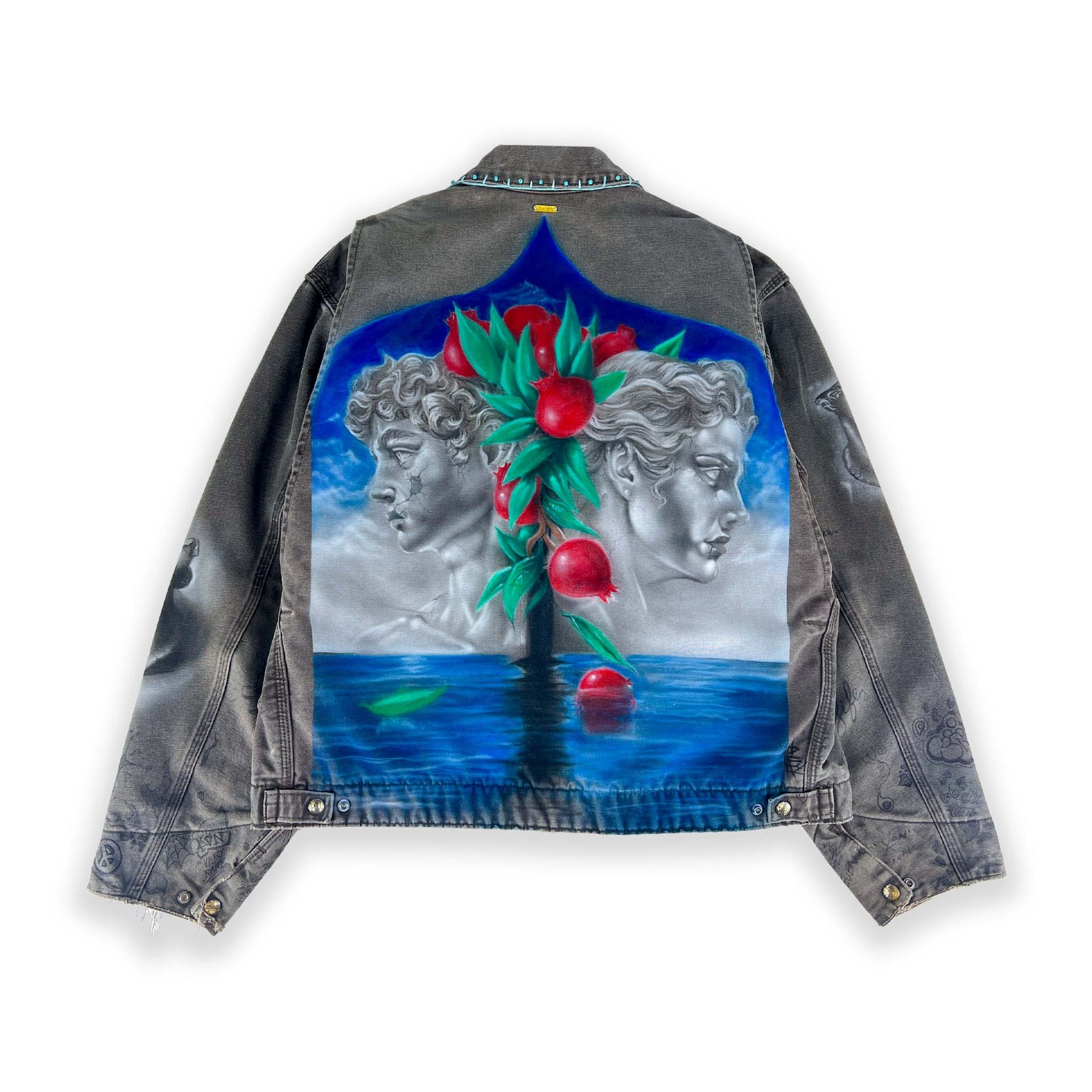A surreal vision captured through a window on the back of this jacket. Paired with hidden hand drawn details and sewn accents, a true masterpiece of collaborative efforts between KON and airbrush artist Jeff Coffey.