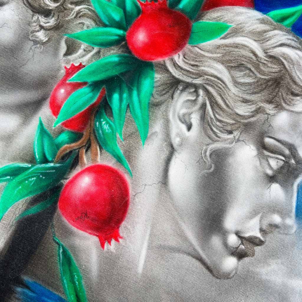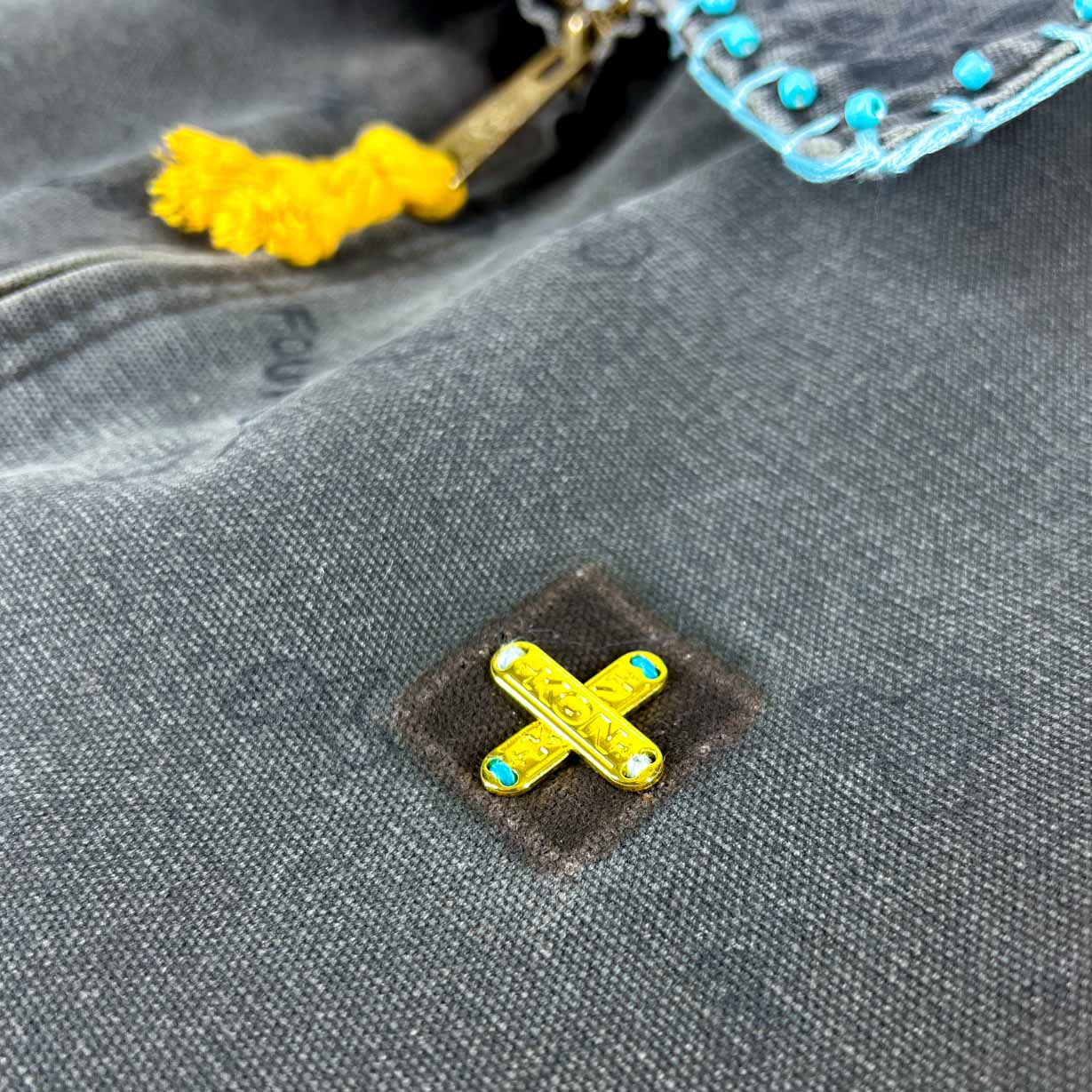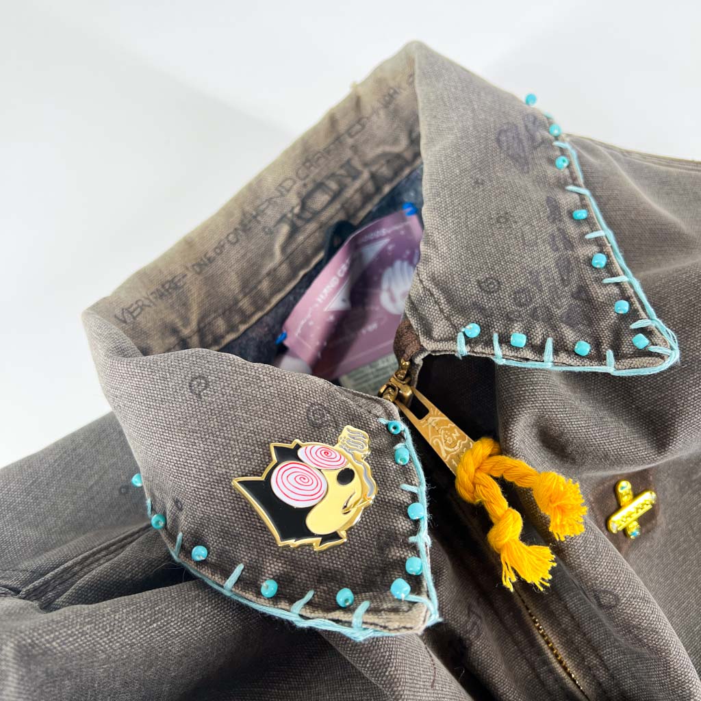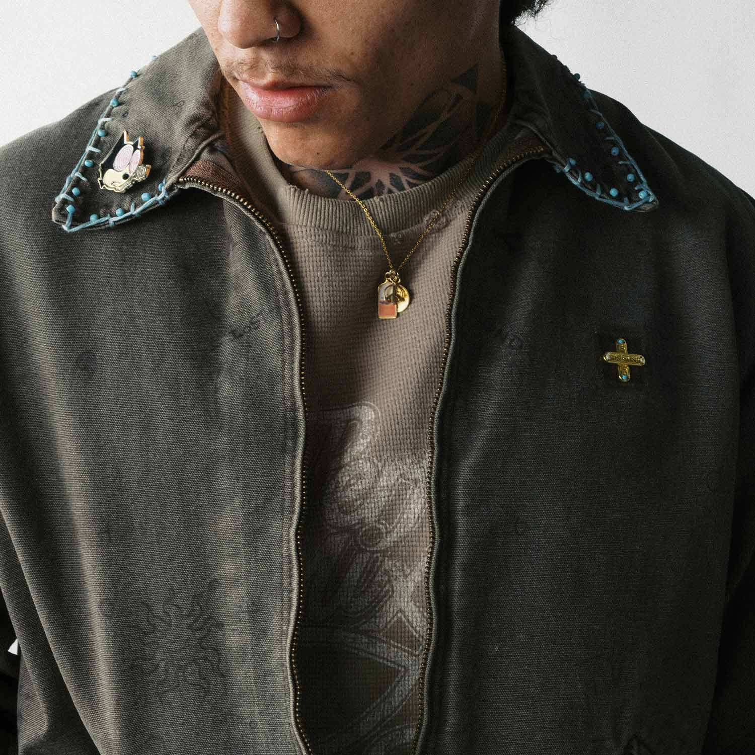 A surreal vision captured through a window on the back of this jacket. Paired with hidden hand drawn details and sewn accents, a true masterpiece of collaborative efforts between KON and airbrush artist Jeff Coffey.